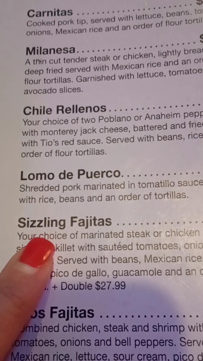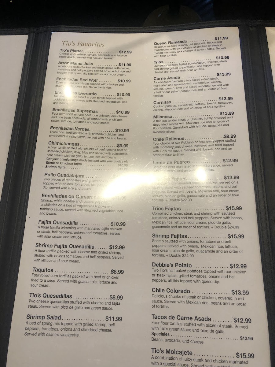 Your choice of two Poblano or Anaheim pepper stuffed with Monterey jack cheese, battered and fried topped with Tio's red sauce. Served with beans , rice, and an order of flour tortillas