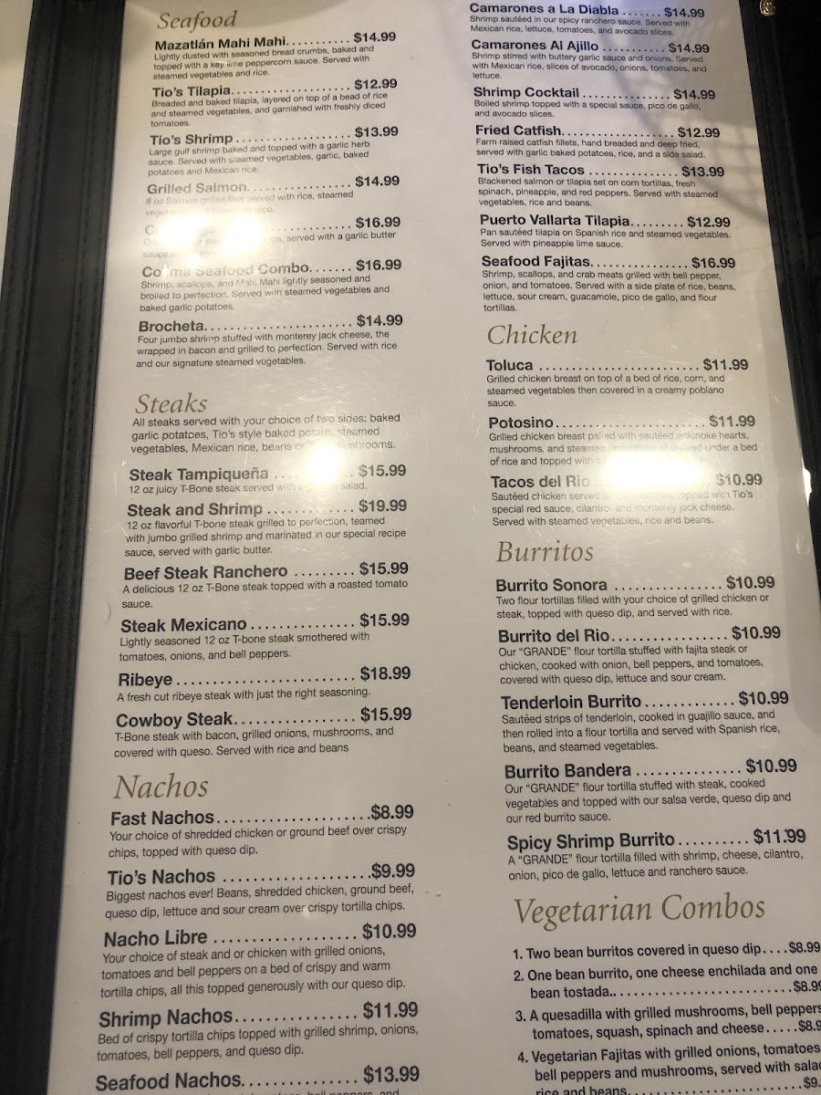 Four flour tortillas stuffed with slices of steak. Served with Tio's green sauce and pico de gallo.
